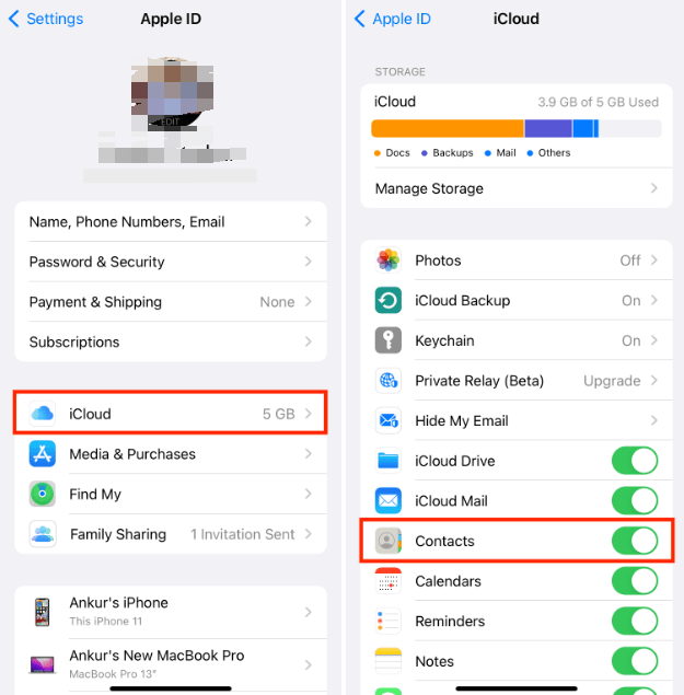 更新或網絡中斷後,iCloud 可能暫時停止同步您的聯繫人。 嘗試先關閉 iCloud 聯繫人並重新連接以查看問題是否已解決。